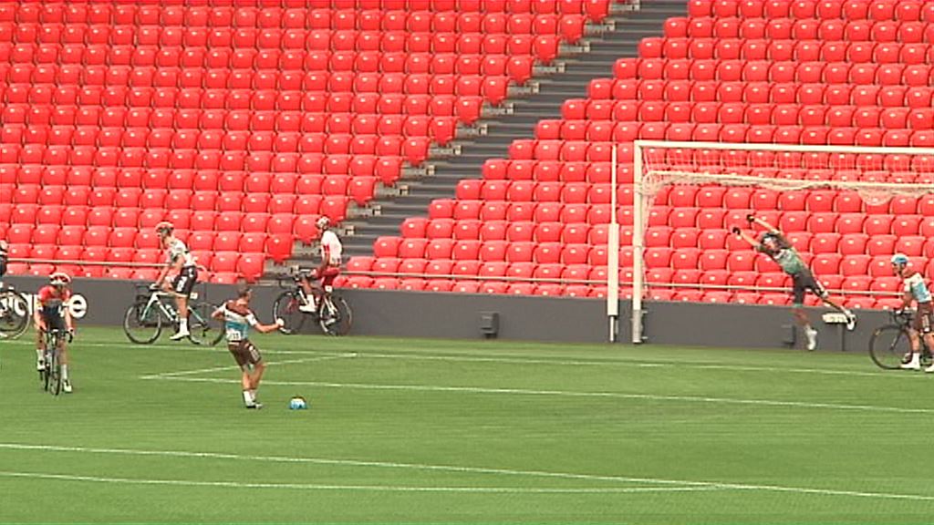 Algunos ciclistas han aprovechado su paso por el césped de San Mamés para simular el lanzamiento de un penalti utilizando su propio casco.