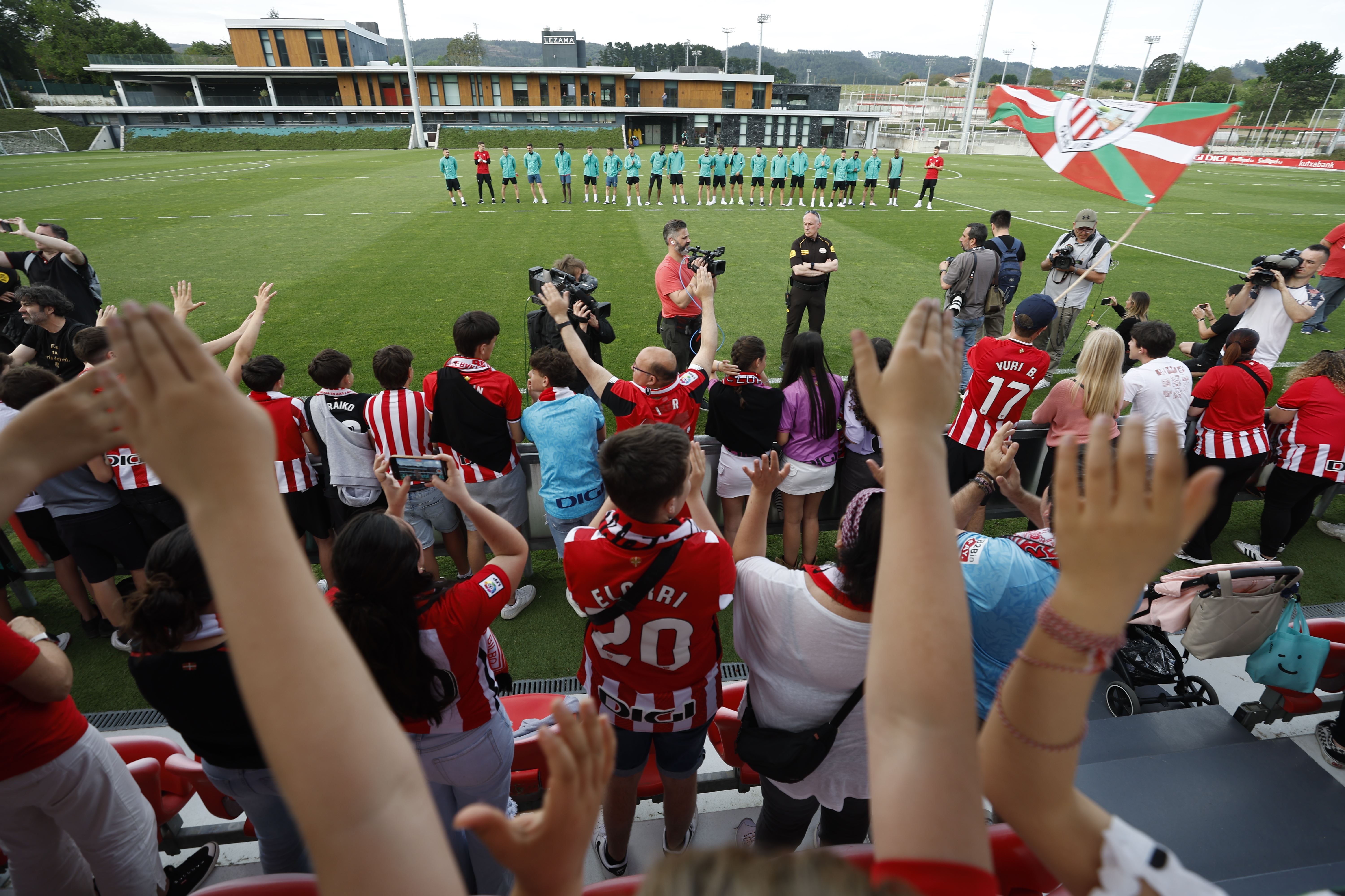 Como ocurrió en la víspera de los encuentros ante la Roma y el Rangers, la afición del equipo bilbaíno se ha desplazado hasta las instalaciones de Lezama para animar a los jugadores de cara a la cita de este jueves en San Mamés.