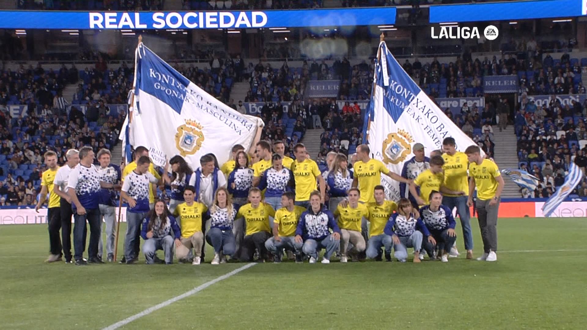 Antes de comenzar el partido entre la Real Sociedad y el Mallorca, los equipos de Arraun Lagunak y de Orio, que han sido los grandes dominadores de la temporada de remo, saltaron al campo, en Anoeta, y toda la afición les dedicó una emotiva ovación.