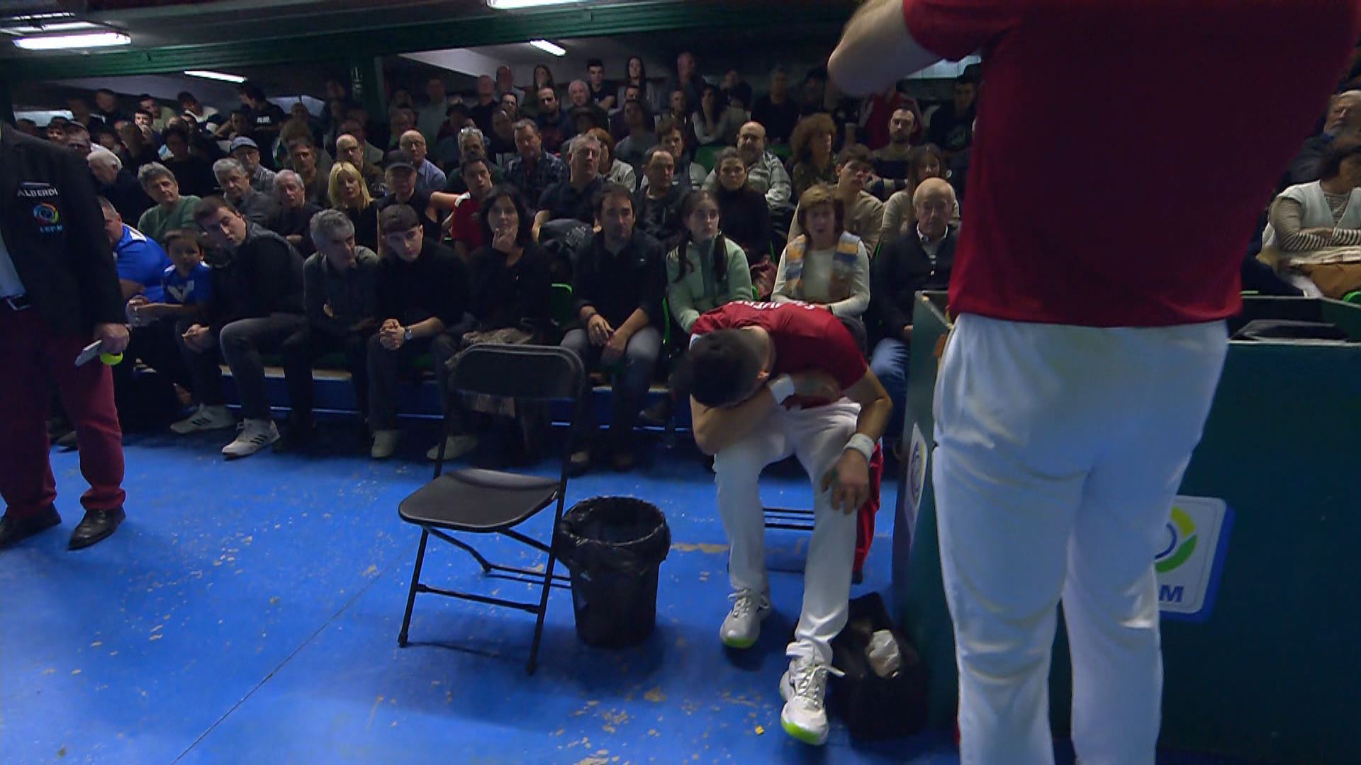 Con 21-18 para Jon Ander Peña y Rubén Salaverri, ante Amiano y Eskiroz, un pelotazo de Peña II hacia la pared ha impactado en la rodilla izquierda del zaguero de Fuenmayor. Salaverri II ha tenido que ir al vestuario, pero, minutos después, se ha recuperado, y ha finalizado el partido.