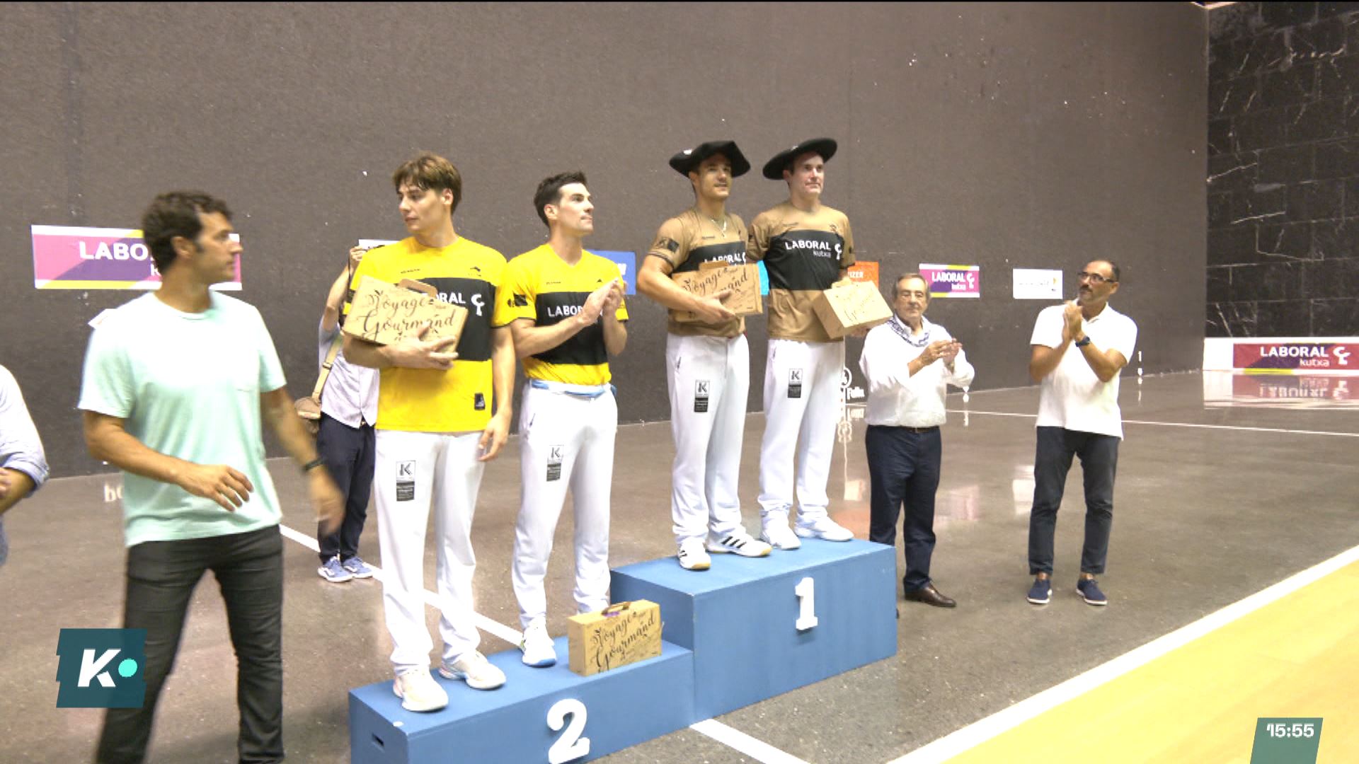 Aritz Erkiaga y Unai Lekerika han ganado el Grand Slam de Gernika tras doblegar en dos sets por 15-12 a Xabi Barandika y Gorka Sorozabal. Gran ambiente en el frontón Jai Alai de Gernika.