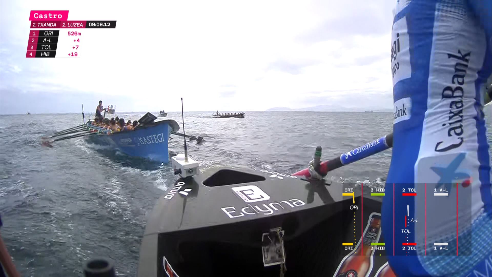 Arraun Lagunak ha invadido la calle de Tolosaldea, que ha acabado remando a la estela de las donostiarras, con un peligro evidente de colisión. El juez de la liga, tras varias advertencias, ha mostrado a Arraun la bandera amarilla.