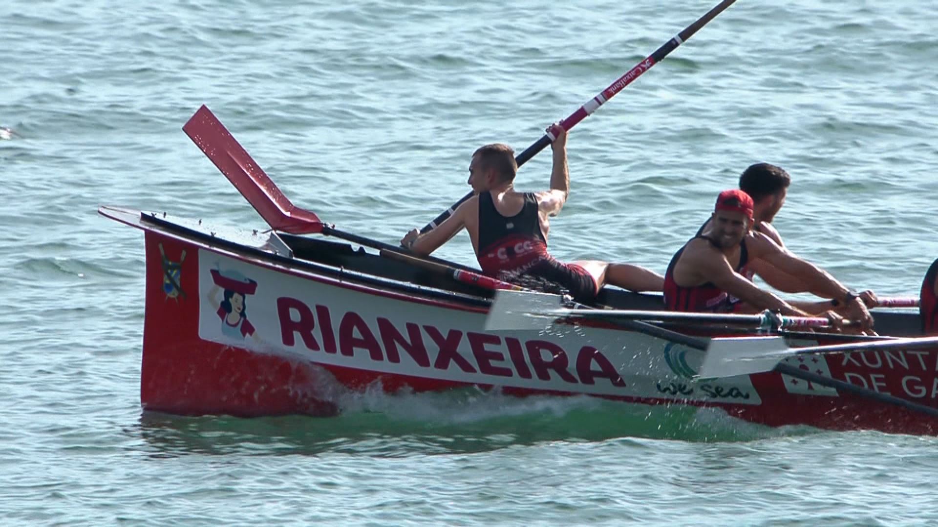 Iago Davila, proel de Cabro da Cruz, ha tenido que tomar la segunda ciaboga con el remo largo, ya que el pequeño se le ha roto en la maniobra anterior. Ha sido la imagen curiosa de la Bandera de Hondarribia.