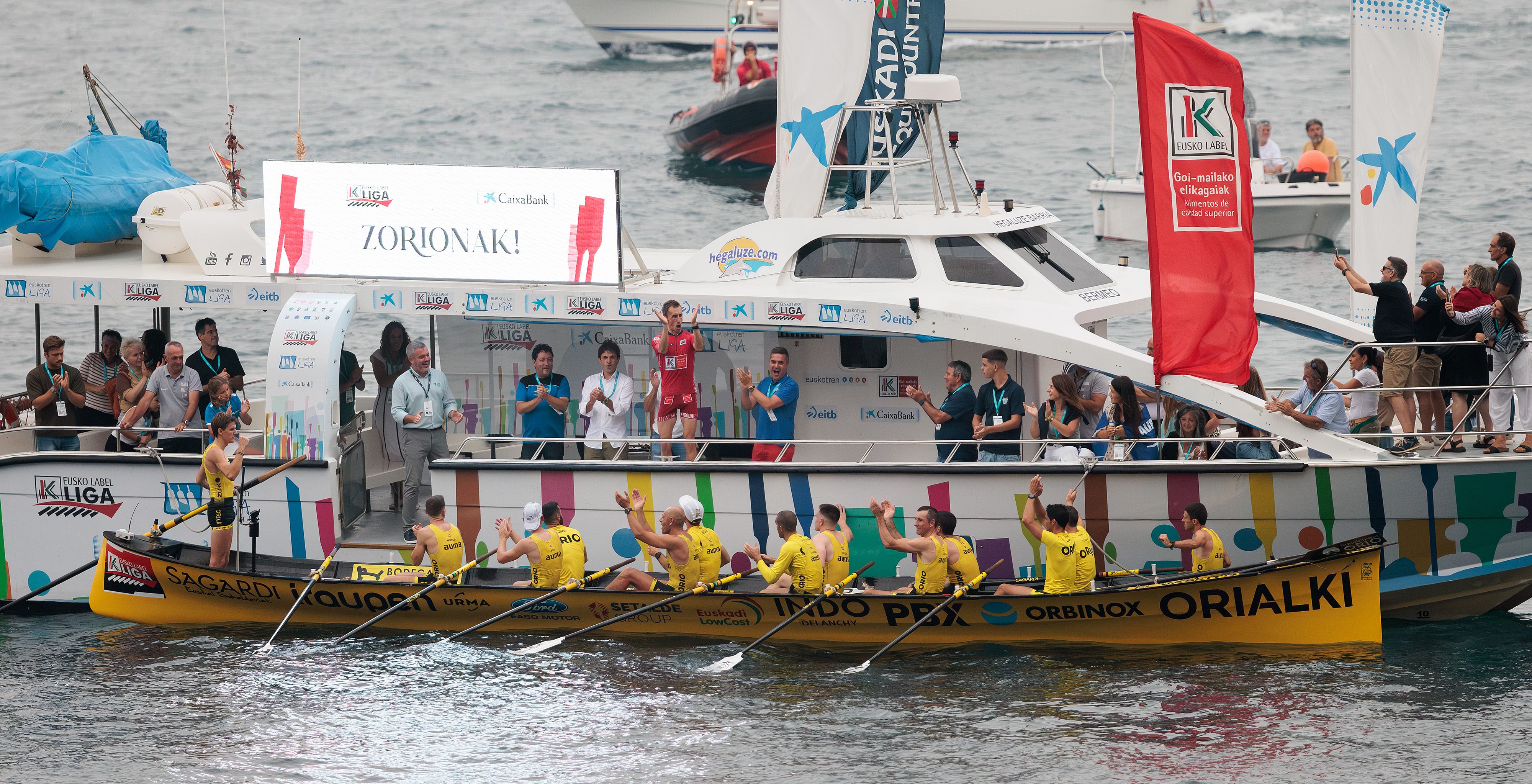 En la primera regata de la Ikurriña de Zarautz, a los oriotarras les ha costado ponerse en marcha, pero, aprovechando la calle Zierbena, han dado la vuelta a la situación para ganar la regata y hacerse con la ventaja.