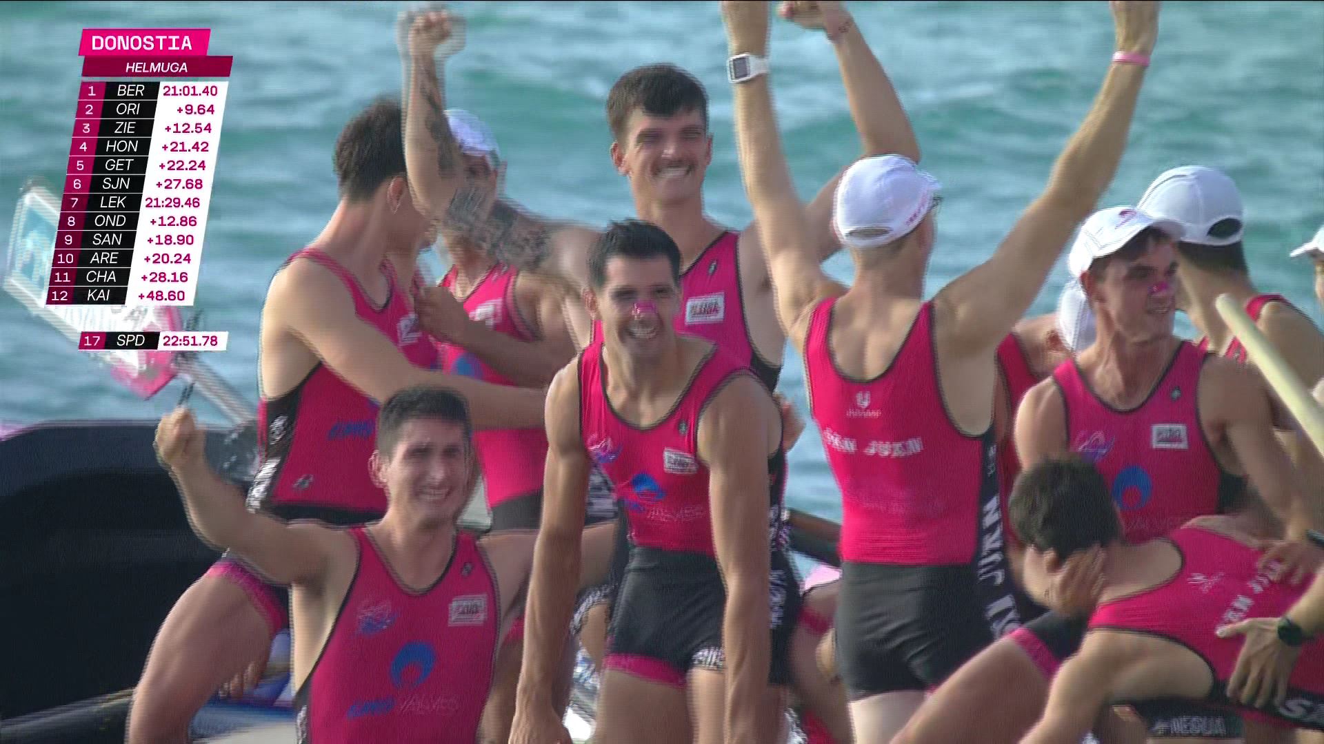 La trainera de San Juan, recién ascendida a la Liga Eusko Label, se ha clasificado para La Concha después de 8 años y lo han celebrado como corresponde dentro de la embarcación.