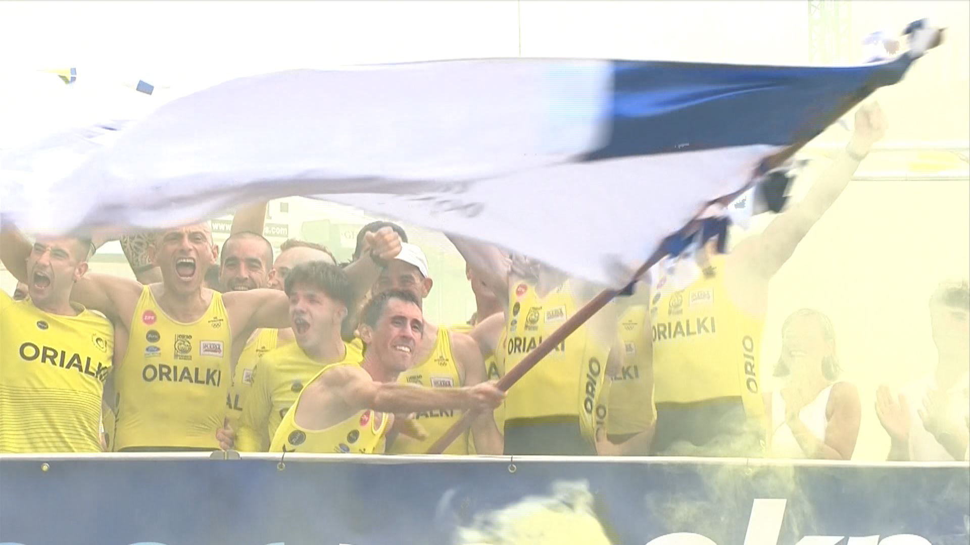 Antes, hemos podido ver a los remeros de Orio, bailando juntos, y al patrón, Gorka Aranberri, recibiendo un premio; con la entrega de la bandera, por parte del alcalde Eneko Goia, la alegría se ha desbordado entre los aguiluchos.
