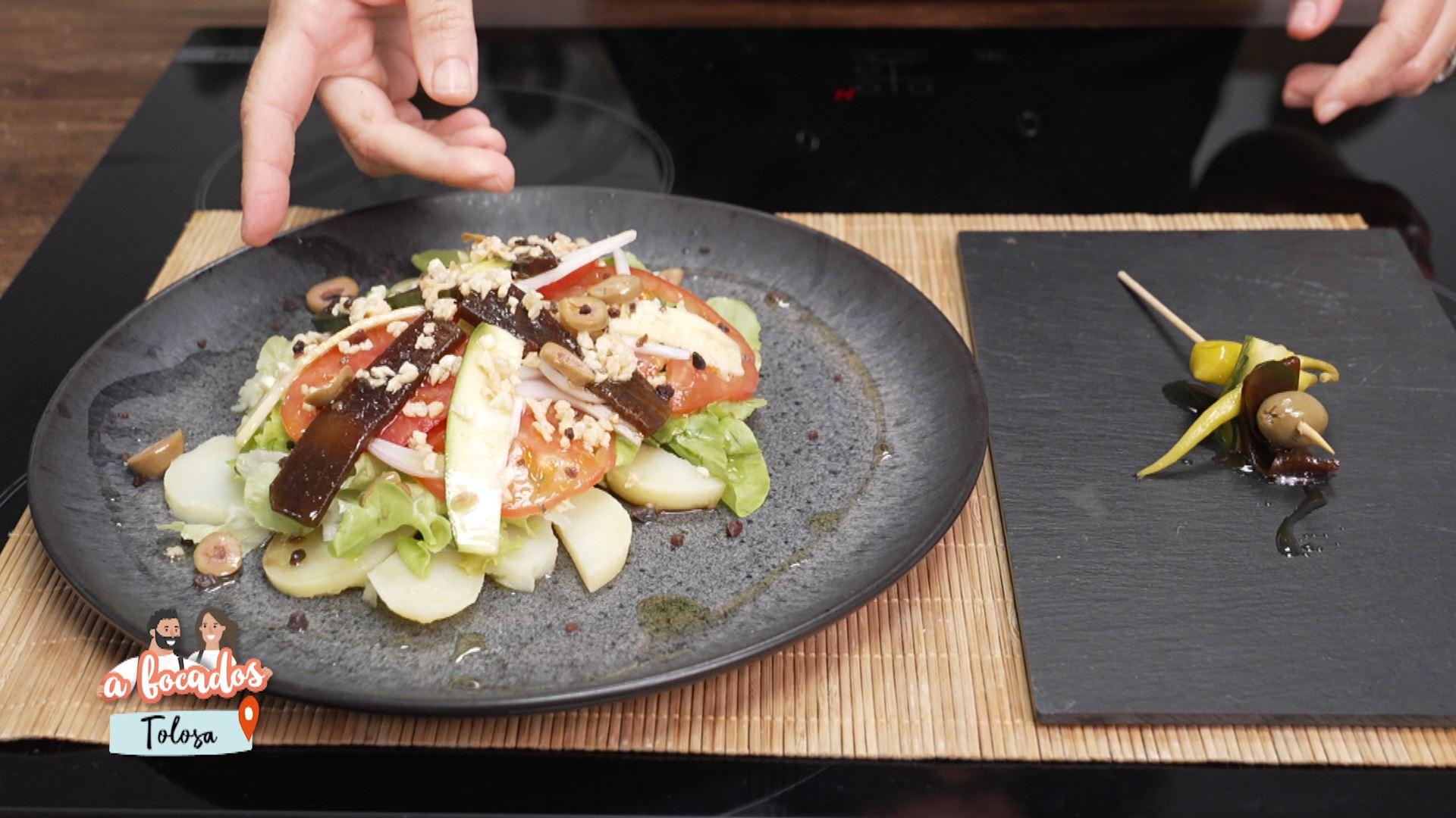 Visitamos Jo Topagunea en Tolosa para que Miriam Ortiz nos prepare una receta vegana con producto local. Prepara una ensalada mixta, pero utiliza calabacín macerado, soja texturizada y sal negra para hacerla vegana.