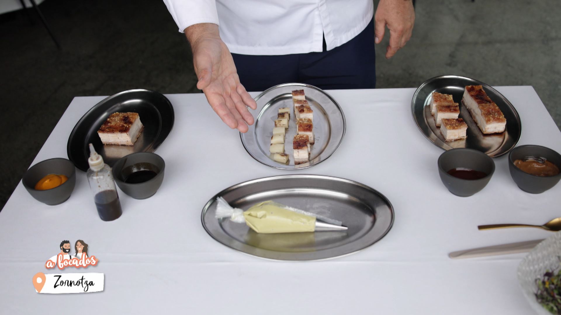 El cocinero Fernando González, del restaurante La Revelia de Amorebieta-Etxano, nos muestra tres emplatados con panceta, y la forma que tiene de incorporar salsas y cremas, según su consistencia, utilizando cucharas, pinceles, biberones o mangas pasteleras.