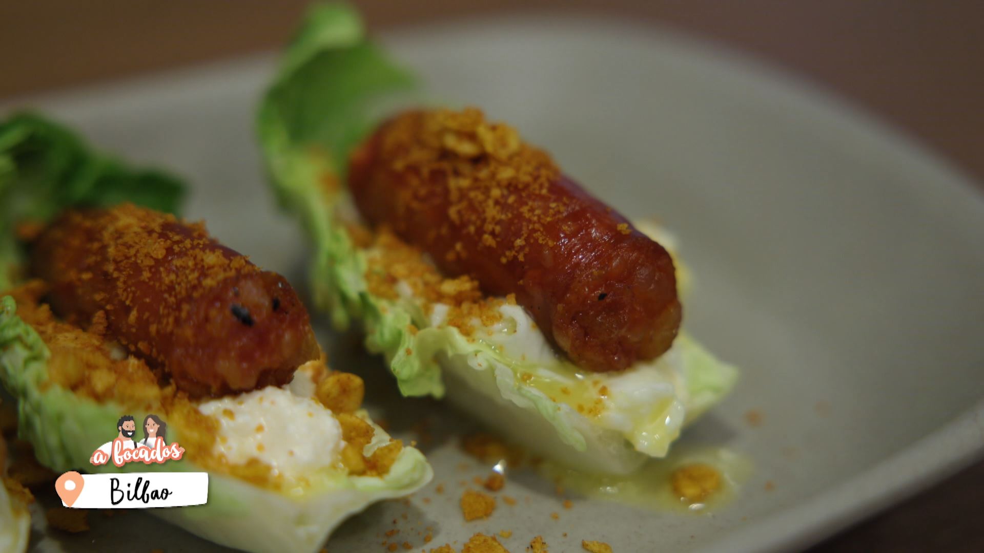 Visitamos el restaurante Los Fueros de Bilbao para probar un plato que mezcla tradición vasca y cocina coreana. El ssam de txistorra, un trocito de txistorra con tartar de huevo frito y requesón sobre una hoja de lechuga.