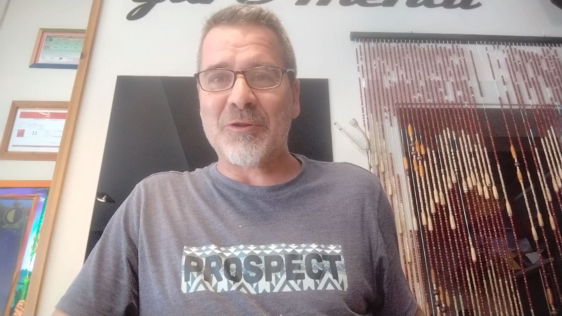 El bilbaíno del barrio de Santutxu nos recibe a la fresca haciendo un crucigrama en la terraza de su bar.