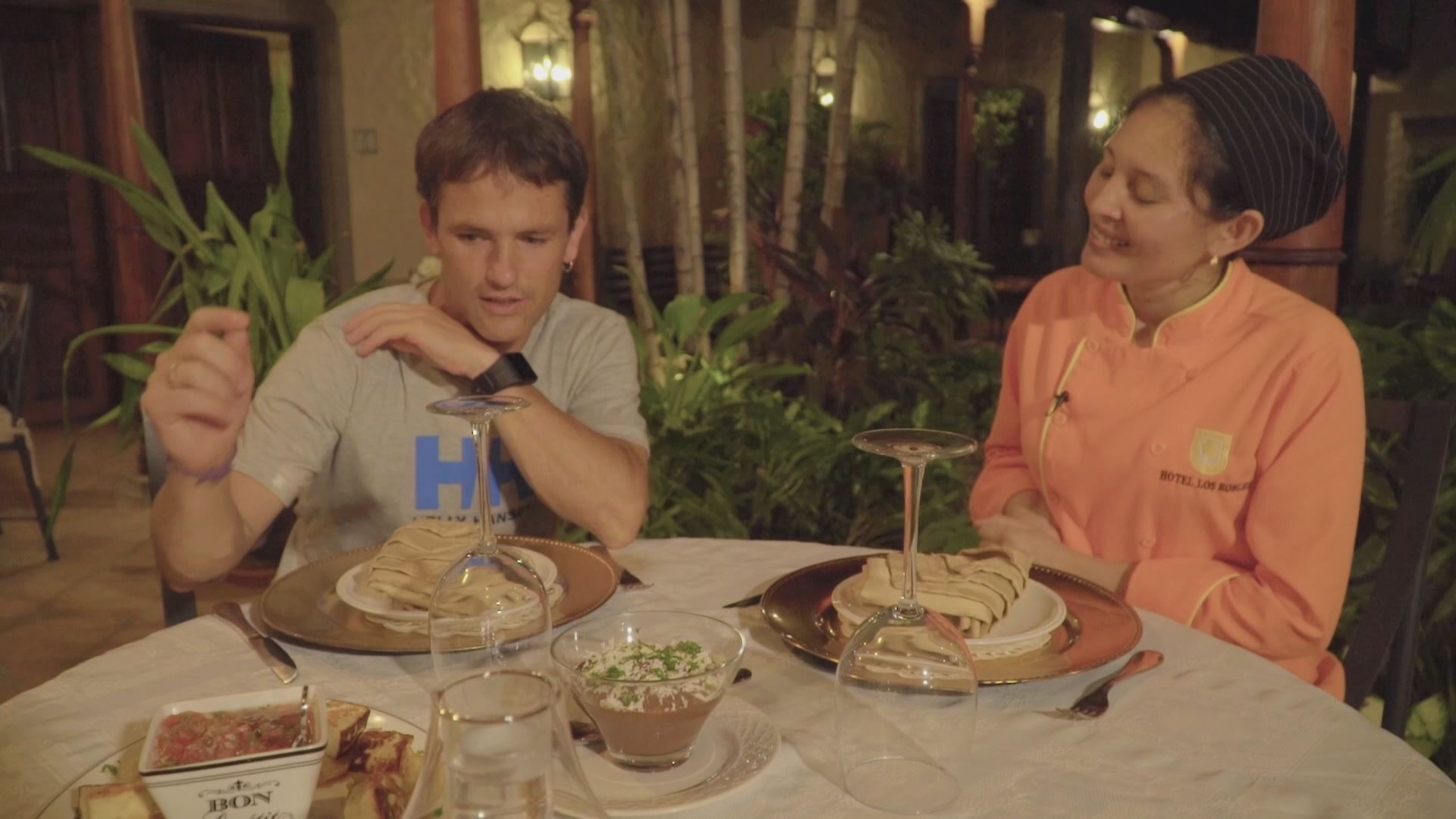 La cocinera del hotel Los Robles de Managua, Silvia Altamirano, le prepara a Zigor Iturrieta el plato nacional de Nicaragua: el Gallo Pinto.