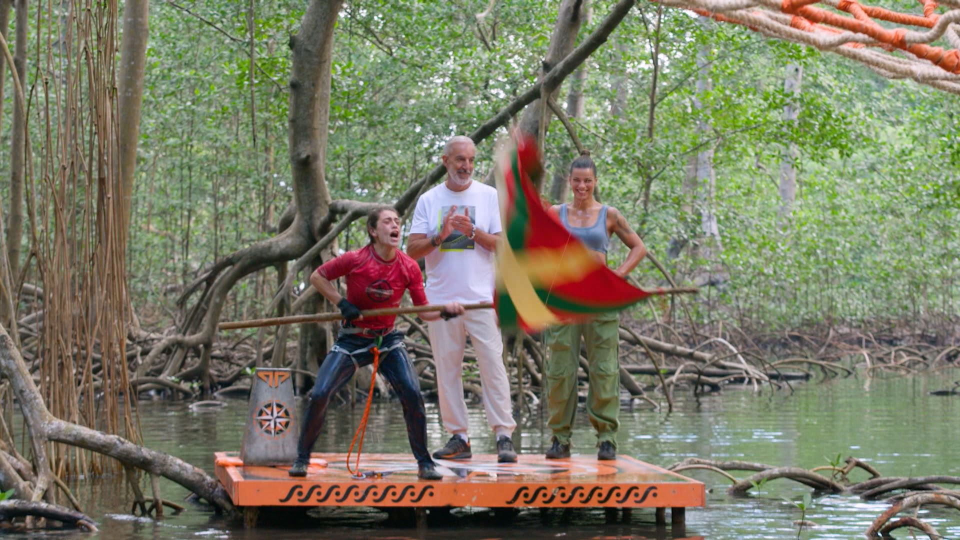 Marcela ha conseguido 3 banderines en el juego de la red invertida, seguida por Xego con 2 banderines. Álex ha quedado descalificado del juego por ir enganchado por la parte de arriba de la red, y Raquel no ha conseguido ningún banderín.