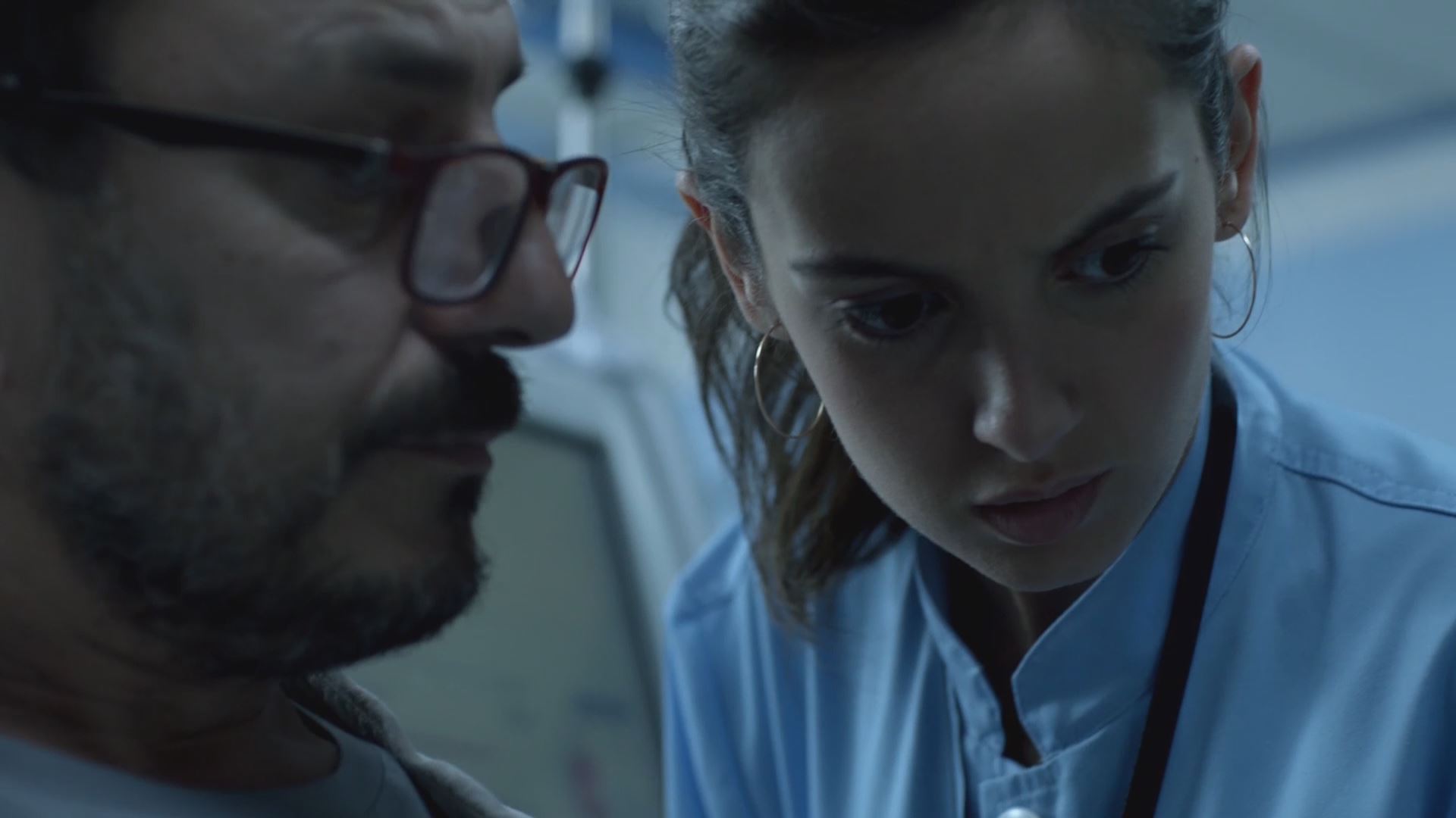 Edurne atiende al periodista Juan Echevarria en el hospital, que le muestra las últimas noticias sobre el atentado. Su novio Omar es el presunto autor del mismo.