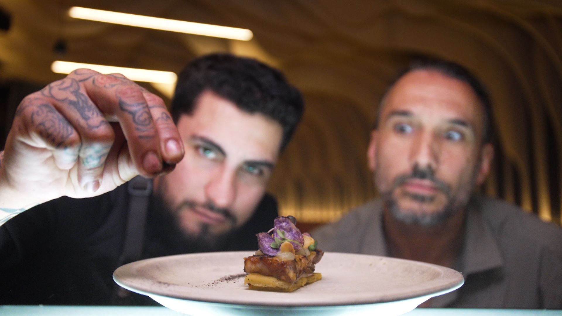 Tradición e innovación van de la mano en el Bar Ssua. La brasa es la reina del establecimiento. Iker Colino nos presenta su pintxo estrella Porrutxerri, una tosta de maíz con puerro a baja temperatura, panceta, grasa de Euskaltxerri y gel de piparra.
