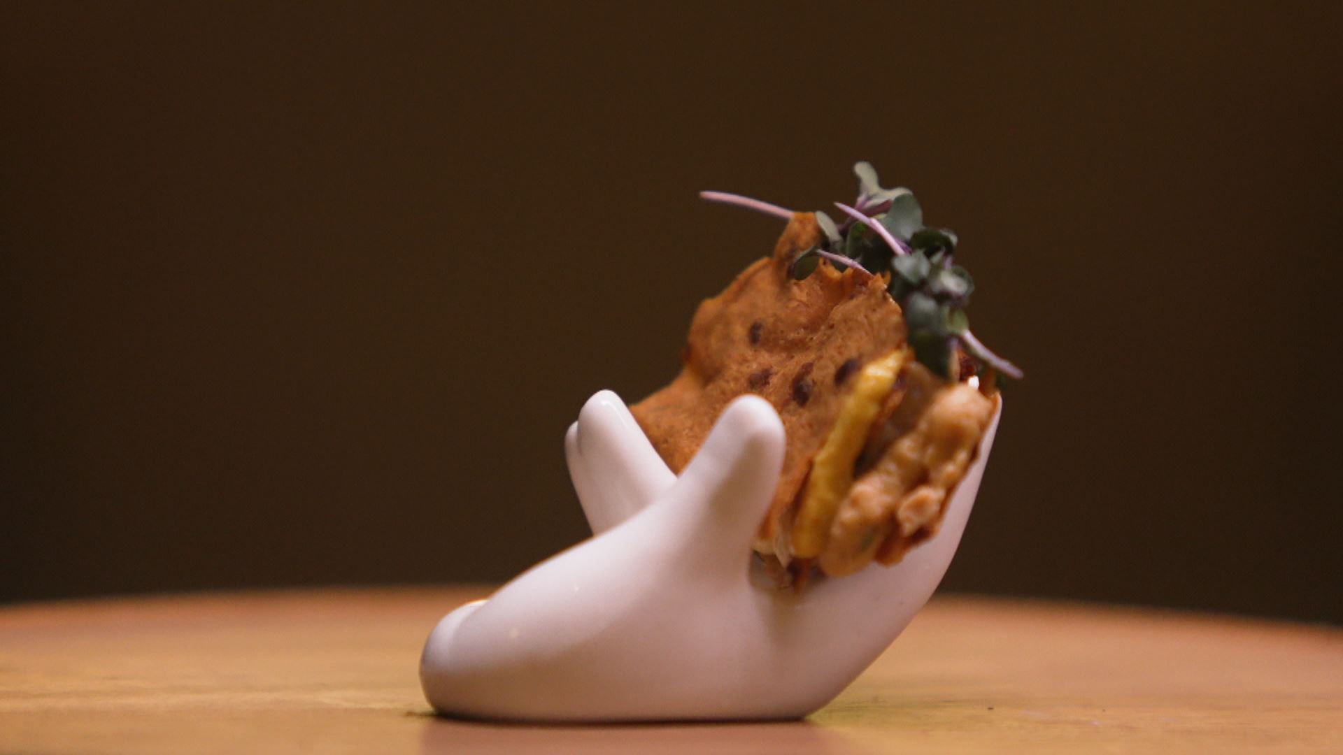 Javi Clemente, copropietario de Tartar taberna de Romo, nos muestra el pintxo que presentan a concurso: Curry de pollo. Además de pollo en distintas texturas, lleva curry, cilantro, jengibre, anís estrellado y pimienta negra.