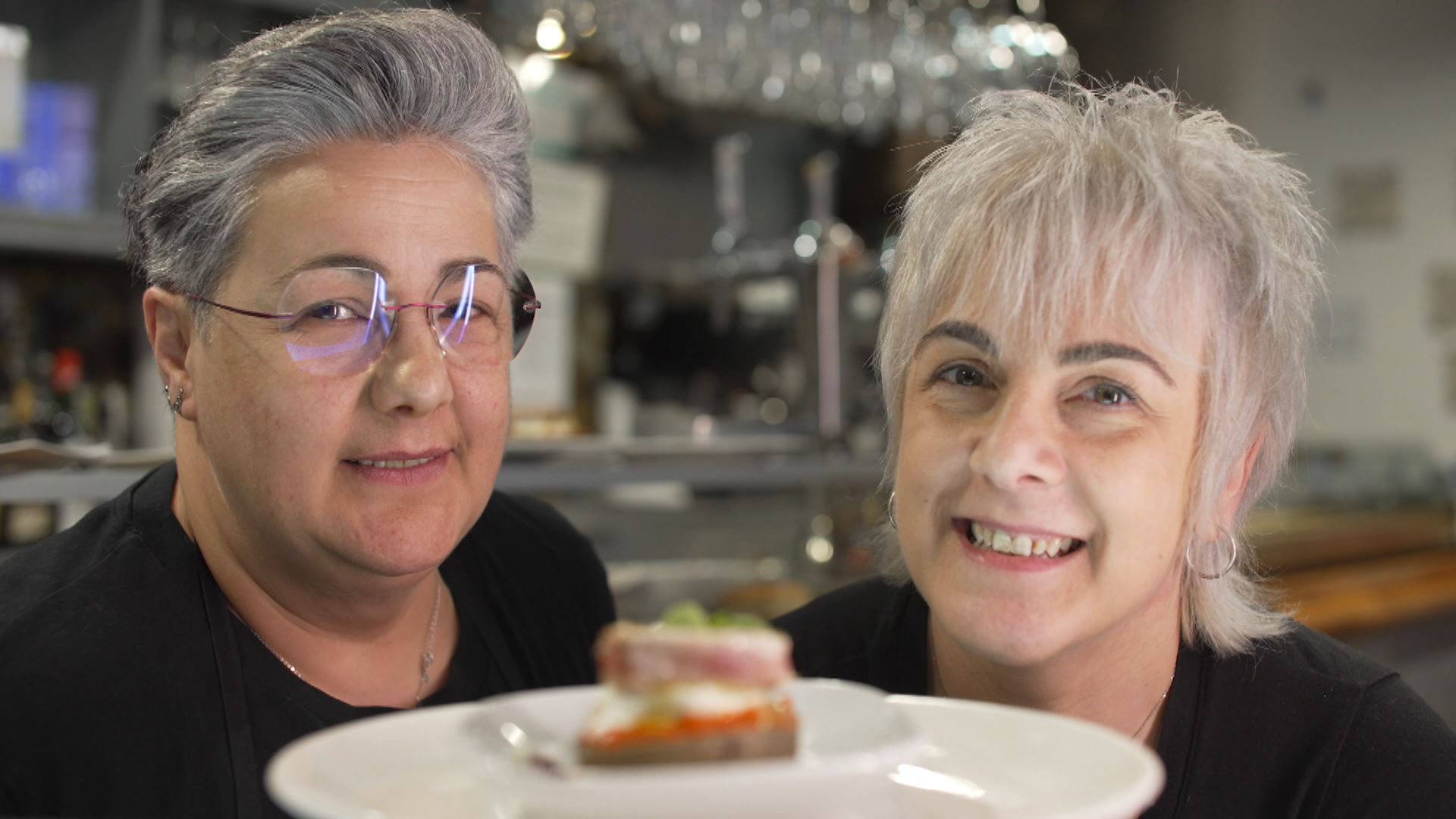 Eskarne e Idoia Flores, copropietarias del bar Toki Alai de Bermeo, nos dan la receta de Ikurriña alai, el pintxo que presenta a concurso en "Pintxo Pote". Se trata de bonito de Bermeo con aguacate, limón, pimiento del piquillo, burrata, albahaca y pan de masa madre de tinta de chipirón.