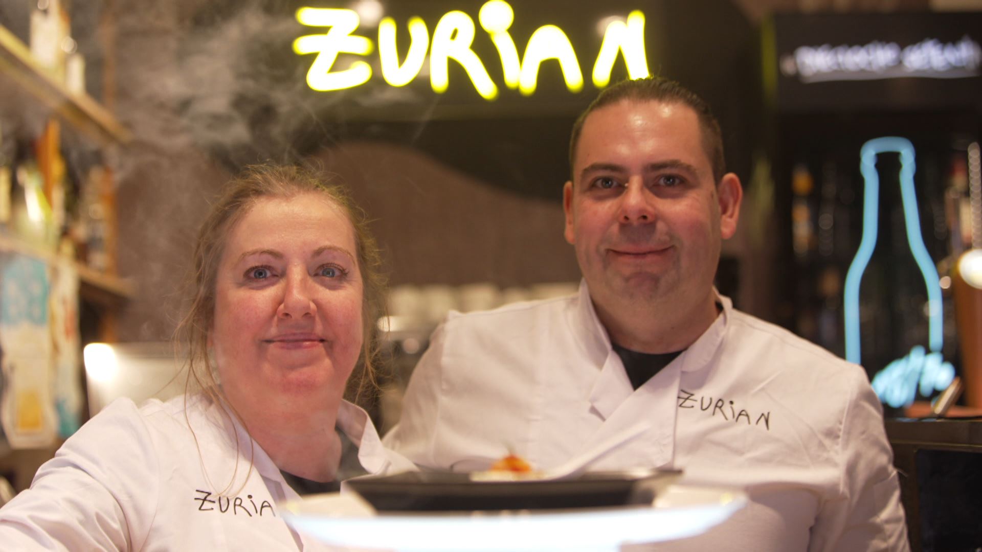 Zuriñe Markiegi y Ángel Blanco, propietarios del bar Zurian de Santurtzi, nos muestran el pintxo que presentan a concurso en "Pintxo Pote": Åke. Se trata de un ajoblanco tradicional malagueño con salmón finlandés, pepinillo encurtido, mermelada de tomate y eneldo.