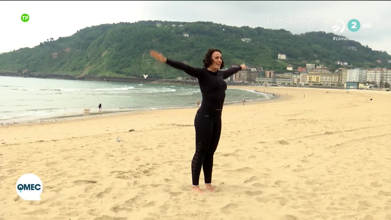 La entrenadora personal Nerea Salinas y el presentador Igor Siguero muestran unos ejercicios de pilates sobre arena en la playa donostiarra de la Zurriola. Los ejercicios sirven para respirar mejor y estirar el cuerpo.