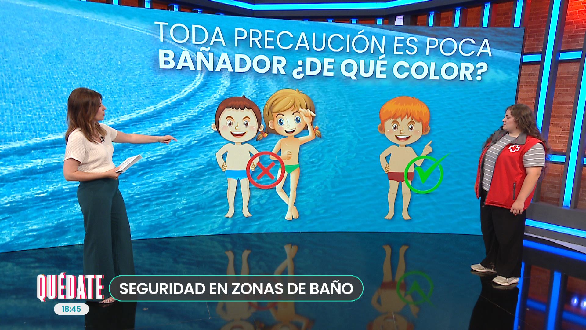Irene Gutiérrez, técnica de socorrismo de la Cruz Roja, nos da consejos y precauciones para evitar sustos con las y los niños en las zonas de baño. No recomienda trajes de baño de colores azules ni verdes para la piscina, ya que si caen al fondo no se ven.