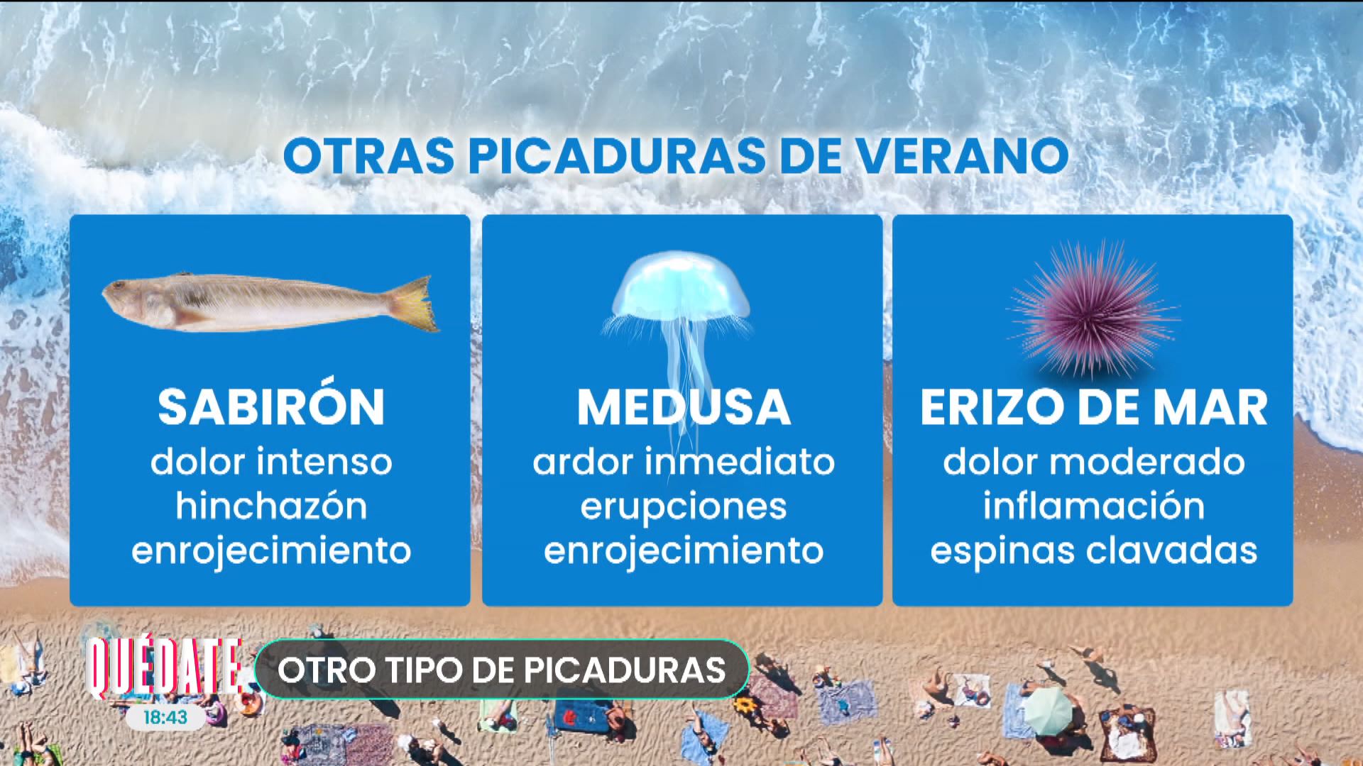 La farmacéutica Ane Jiménez nos indica cuáles son las diferencias entre la picadura de la carabela portuguesa y la medusa. Y es que, aunque son parecidas, el tratamiento puede ser diferente. Pero no son los únicos organismos que pican. Mucho cuidado con los sabirones y los erizos de mar.