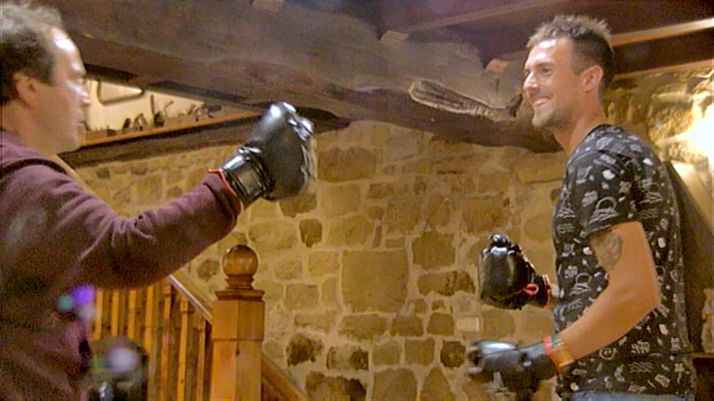 Endika ha sido boxeador, y Manu se ha empeñado en que tenía que aprender el juego de pies. Puede que se haya arrepentido de su decisión cuando Endika le ha dejado tumbado en el suelo.