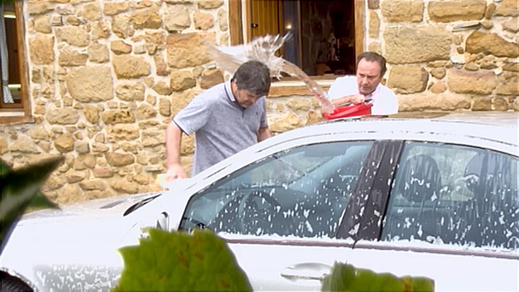 Víctor le ha pedido ayuda a Pedro para limpiar su Mercedes. Con la excusa de que le duele la cintura, Pedro se las ha apañado para escaquearse de la tarea, y ha acabado bañando a su consuegro.