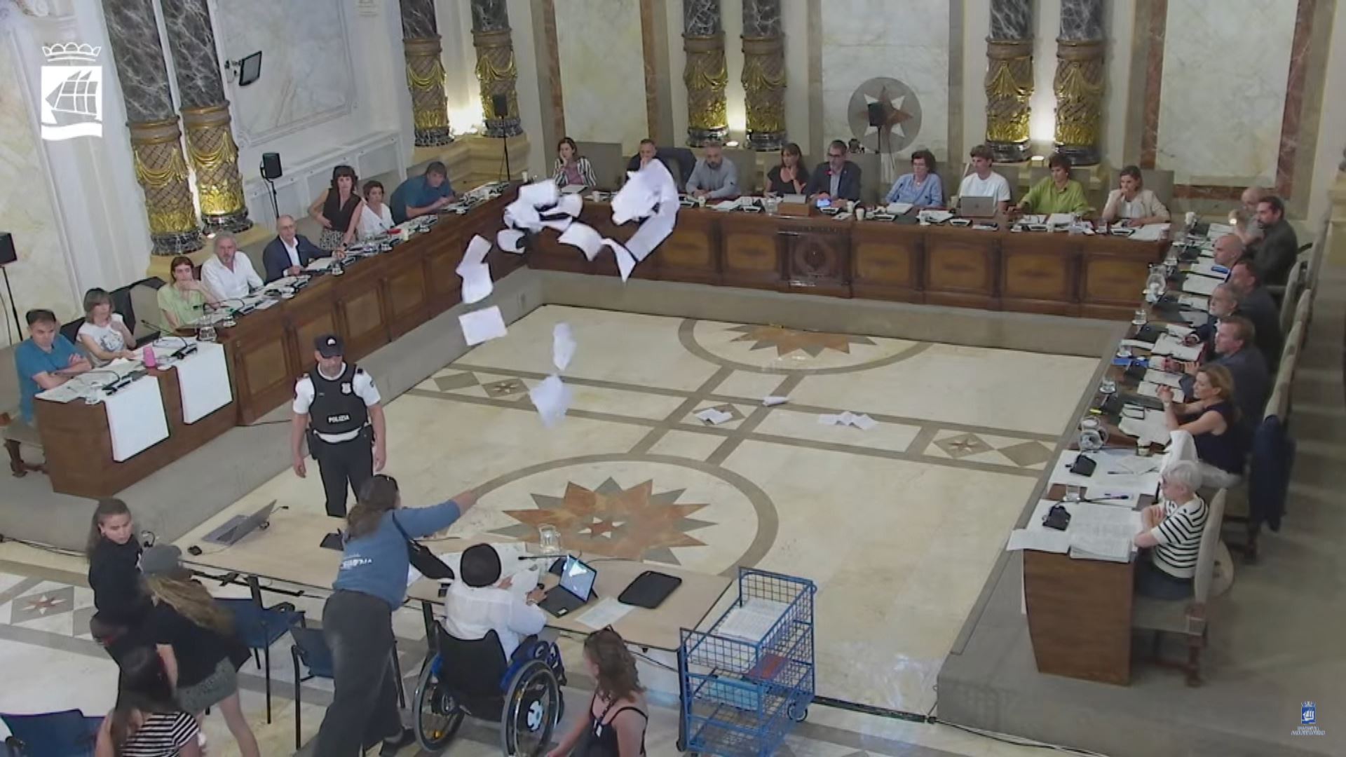 Gazteak Donostiako Udaleko osoko bilkuran sartu dira, Urgulleko Guardetxea husteko arriskuagatik protesta egiteko. Udaltzaingoa gazteak aretotik ateratzen saitu denean liskarrak izan dira eta 4 agente zauritu dira. Atxilotua aske utzi dute ondoren. (Irudiak: Irutxuloko Hitza eta Donostiako Udala)