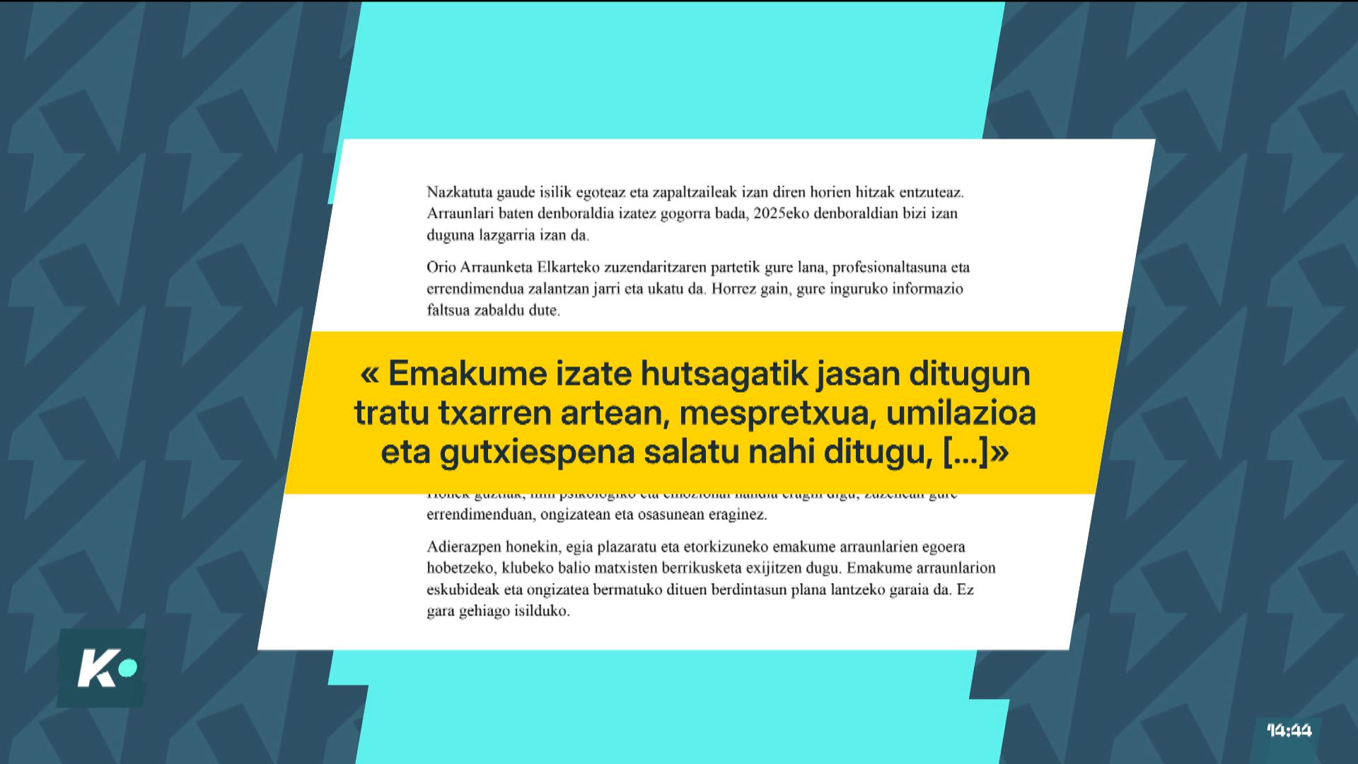 Oharrean diote Zuzendaritzak zalantzan jarri duela eta ez dituela baloratu taldeak 2025eko denboraldian egindako lana, lortutako emaitzak eta izandako profesionaltasuna. Horrez gain, salatu dute gutxietsiak izan direla emakumeak izateagatik.
