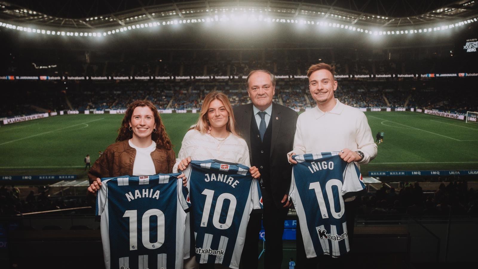 Realaren eta Sevillaren arteko partida hasi aurretik, Janire Gonzalez-Etxabarri, Iñigo Llopis eta Nahia Zudaire omendu dituzte Anoetan. Gonzalez-Etxabarrik urrezko domina bereganatu du munduko surf txapelketan, eta beste horrenbeste lortu dute Llopisek eta Zudairek igeriketako munduko txapelketan.