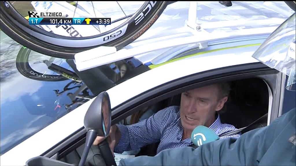 Orica taldeko zuzendariak euskaraz erantzun dio Alfonso Arroio ETBko kazetariari bigarren etapa jokatzen ari zela zuzenean egin dion elkarrizketan.