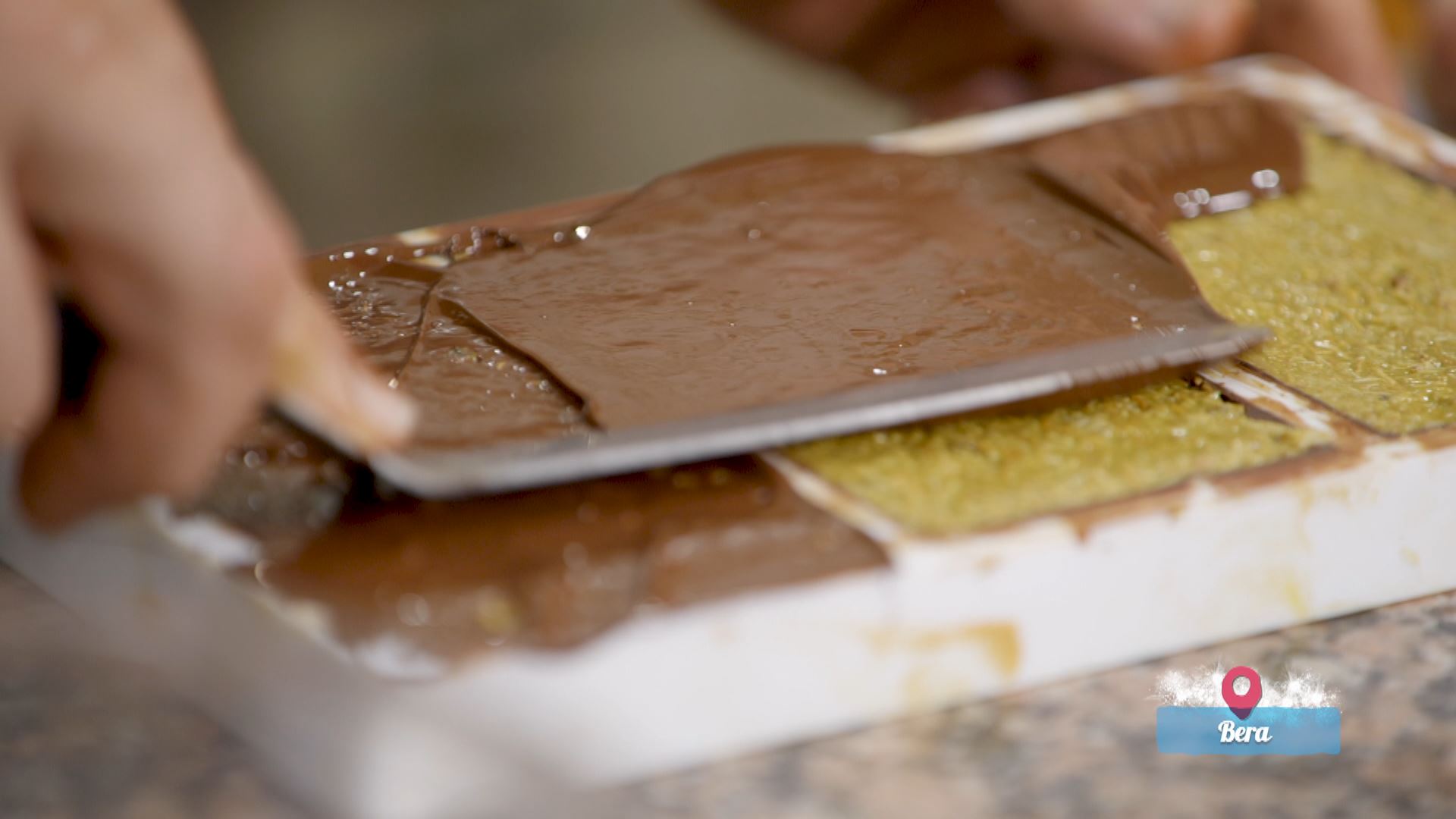 Moldean, txokolate geruza fina egin du lehenik Iñigo Sarobe gozogileak. Ondoren, pistatxoz, txokolate zuriz eta filo pastaz egindako betegarria, eta, atzera, txokolatearekin estali du moldea. Emaitza ikusgarria da, edozein txokolatezaleren ahogozagarri.