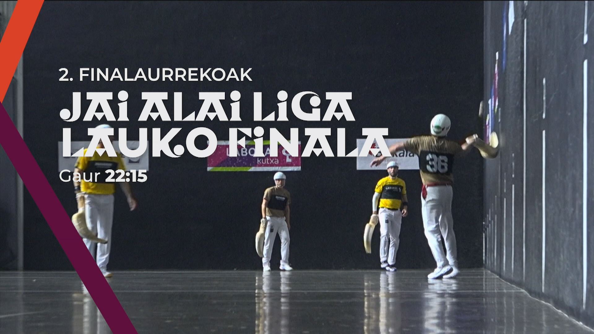 Iritsi da Jai Alaiko lauko finala. Gaur, bigarren finalaurrekoetan, lehenik, Erkiaga eta Gorka pilotariak Barandika eta Lopezen aurka neurtuko dira. Ondoren, emakumezkoen txanda izango da: Elaia eta Maia Maite eta Maialenen aurka jokatuko dute. 22:15etik aurrera, ETB1en eta eitb.eus atarian.