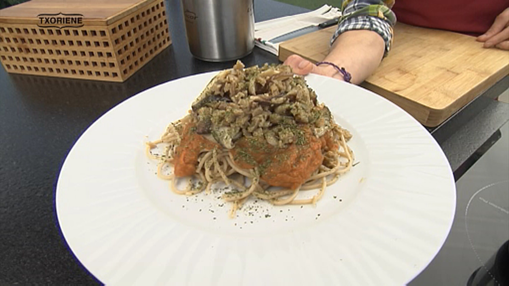 Gorka Gereño sukaldari makrobiotikoarekin batera, espagetiak tomato saltsan, onddoekin eta seitanarekin, prestatu ditu Zigor Iturrietak 'Txoriene' saioan.