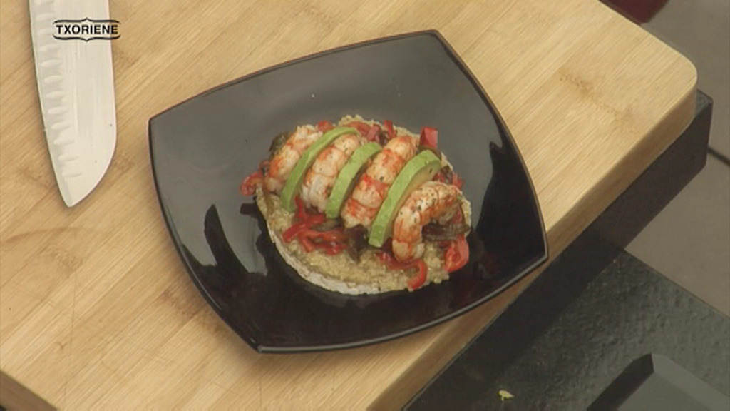 Gorka Gereño sukaldari makrobiotikoarekin, honako plater hau prestatu du Zigor Iturrietak 'Txoriene' saioan: kinoa, piper entsaladrekin, ahuakatearekin eta ganbekin.